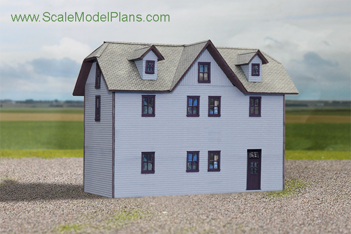 This is an N Scale model constructed with 1/32" clapboard siding from Northeastern Scale Lumber Co. Roofing texture was generated by Model Builder ® software.